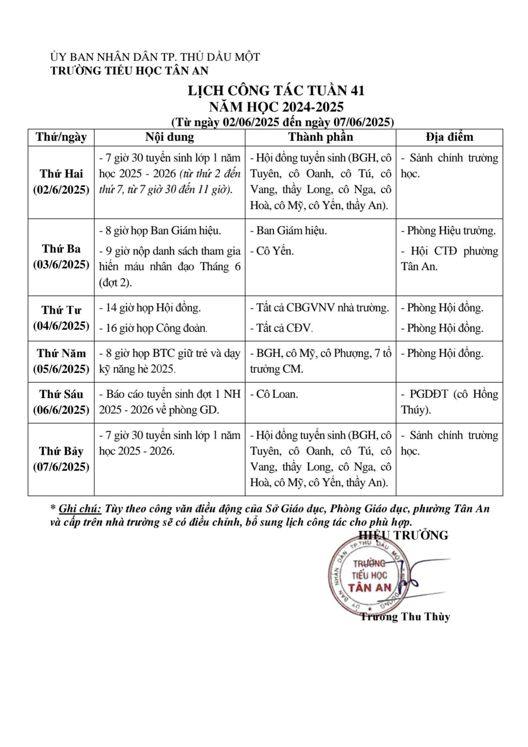 Lich làm việc trường TH Tân An